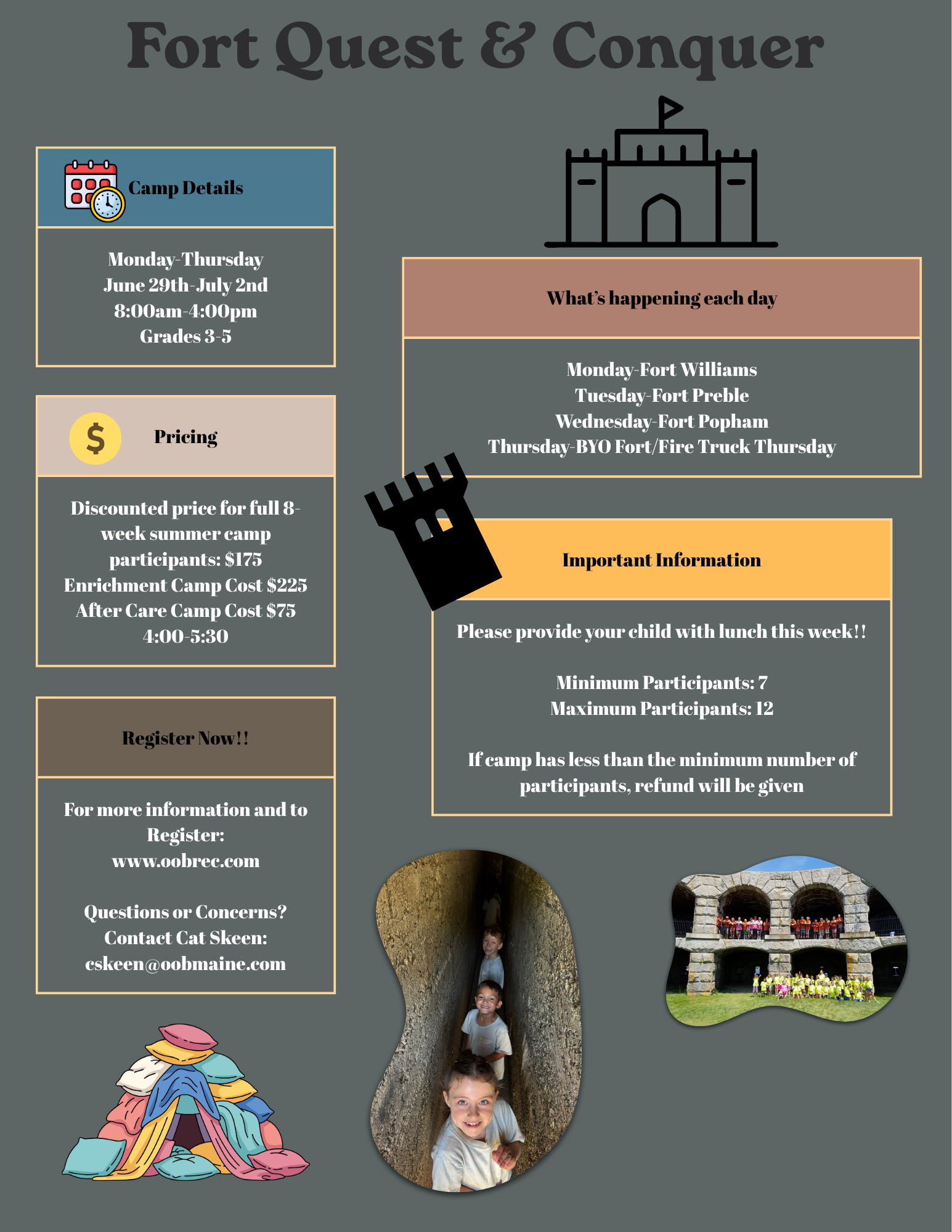 Each day, campers will explore a different historic fort, uncovering secrets of the past! Back at our base camp in OOB, they'll design and build their own EPIC fort creations. Plus, they'll join in on the excitement of Fire Truck Thursday with the rest of our campers! This action-packed week blends history, creativity, and teamwork into one unforgettable quest!