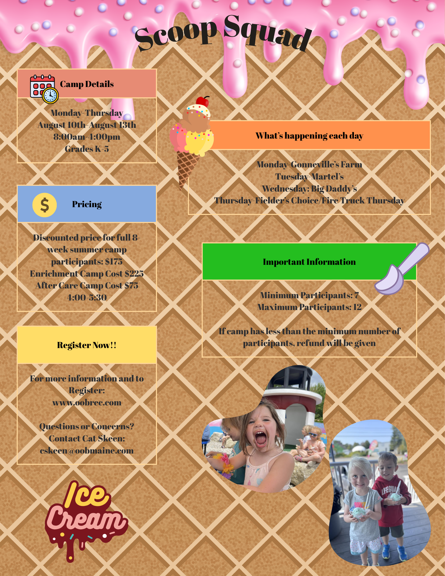 Scoop Squad is the ultimate ice cream adventure, with a delicious destination or activity each day! Campers will explore local spots, try new flavors, and enjoy frozen fun all week long--plus join in on Fire Truck Thursday! It's a cool, tasty, and unforgettable experience for any kid with a sweet tooth!